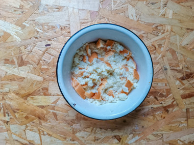 Срежьте с хлеба корки, раскрошите его в миску и залейте молоком. Я дополнительно размяла его вилкой. Оставьте хлеб минут на 5, чтобы он как следует размок. Хлеб в котлеты добавляют для того, чтобы он впитал в себя выделившийся из мяса сок. Благодаря этому котлеты останутся сочными. Берите именно черствый хлеб, свежий впитывает плохо. Подойдет и батон, и обычный белый, и простая булочка.