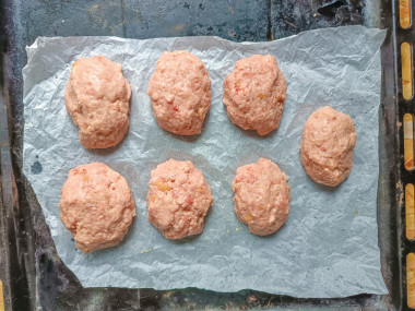 Котлеты запекала около 35 минут при 180 градусах на противне, застеленном силиконизированным пергаментом. У меня получилось семь котлет среднего размера.
