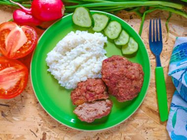 Котлеты получились с ярким мясным вкусом, плотные, но при этом мягкие и нежные. Подавала котлеты с отварным рисом.