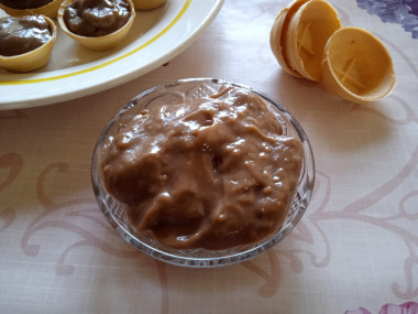 Сделала шоколадный заварной крем с какао для торта. Только использовала не для прослойки торта этот крем, а для наполнения тарталеток. Приготовление очень лёгкое и быстрое. Соединила продукты по рецепту в кастрюльке, как пишет автор. Варила на маленьком огне почти до закипания. Затем взбила крем ещё горячим. Накрыла миску с кремом пакетиком и дала остыть. Крем получился очень густым, вкусным, шоколадным и блестящим. Уже остывшим кремом наполнила маленькие тарталетки и десерт готов. Прекрасный рецепт простого шоколадного крема из доступных продуктов. Моему ребенку такой крем очень понравился и без тарталеток))) Большое спасибо автору!