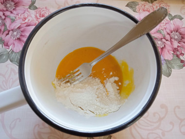 Вбейте куриные яйца в миску и слегка взбейте их миксером на минимальной скорости. Просейте необходимое количество пшеничной белой муки высшего сорта, разбейте все комочки. Добавьте просеянную муку к взбитым яйцам. Влейте в миску с яичной смесью 1/10 часть заранее приготовленного для крема молока. Всё вместе взбейте на минимальной скорости миксером до объединения ингредиентов. Не взбивайте смесь слишком сильно.