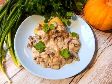 Готовые лесные грибы в сметанном соусе подавайте горячими. Они могут выступать как самостоятельное блюдо. Также к ним подойдет отварной картофель и свежая зелень.