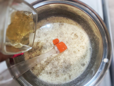 Листовой желатин залейте холодной водой. Если у вас порошковый желатин, то залейте его 50 мл воды. Оставьте желатин набухать на 5-7 минут.