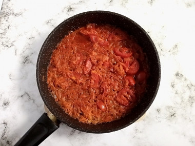 Добавьте томатную пасту и всё хорошо перемешайте. Вместо томатной пасты можно взять свежие помидоры, кетчуп или томатный сок.