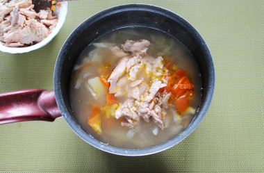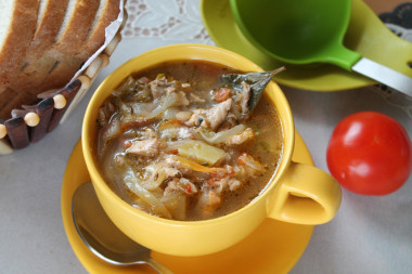 Рыбные щи из свежей капусты и консервов готовы. При подаче предложите каждому молотый чёрный перец.