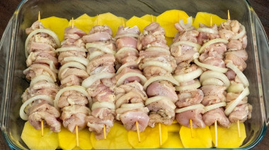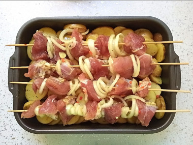 В смазанную растительным маслом форму для запекания выложите картошку. О том, как выбрать форму для запекания, читайте в отдельной статье по ссылке в конце рецепта. Поверх картошки распределите шпажки с шашлычками. Сверху полейте все остатками маринада от мяса. Можете также влить немного воды.