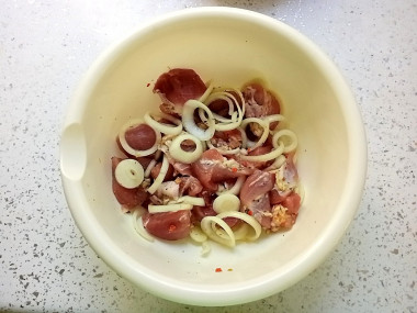 В миске соедините мясо, лук, растительное масло и уксус. Добавьте специи и все аккуратно перемешайте, стараясь сохранить кольца лука целыми. Оставьте все мариноваться на 2 часа. Я это делала при комнатной температуре, потому что было прохладно. Если есть возможность, то можете мариновать мясо с вечера, но не забудьте поставить его в холодильник.