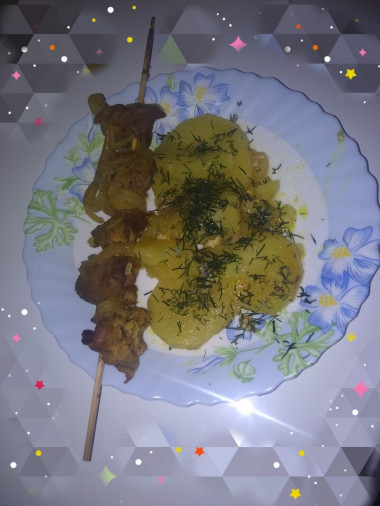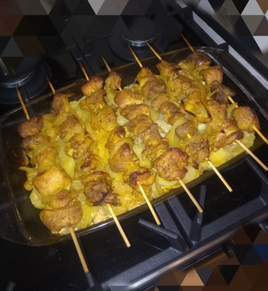 Интересно, что картошка помимо своих специй пропиталась еще и луково-мясным соком. Это очень вкусно, а картошечка просто тает во рту! И мясо получилось мягким, я даже не ожидала). Думаю в следующий раз взять свинину пожирнее и шашлычков сделать побольше.