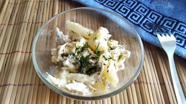 Также в качестве заправки можно использовать не только майонез, но и сметану или натуральный йогурт. Их можно взять по отдельности либо смешать с майонезом в любой пропорции на свой вкус - это снизит калорийность блюда.