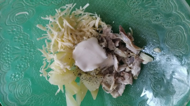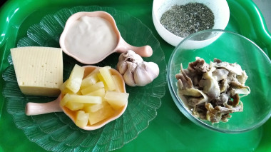 Как сделать салат с ананасом, курицей, сыром, чесноком и майонезом? Подготовьте все необходимые продукты. Если гостей ожидается много, то удвойте или даже утройте количество ингредиентов. Количество чеснока можно регулировать на свой вкус.