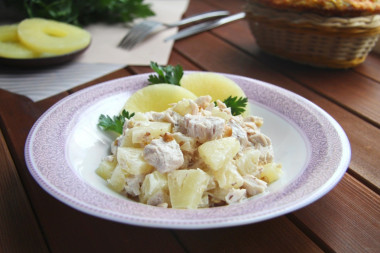 Замечательный салат из доступных продуктов на скорую руку - салат с ананасом и курицей и сыром с чесноком. Я сделала для себя буквально одну порцию, для этого уменьшила указанное количество продуктов в рецепте. Порезала мясо с жареного куриного бедрышка, натерла сыр на терке, ананас консервированный был в банке уже кусочками, их я отжала от сиропа Сухие травы смешала с перцем и солью, чеснок натерла на мелкой терке, смешала все вместе в салатнике, добавила домашний майонез. При подаче посыпала мелко нарезанной зеленью укропа. Этот салат очень понравился пикантной ноткой чеснока и сладкой остринкой ананаса. Спасибо за такой прекрасный рецепт.