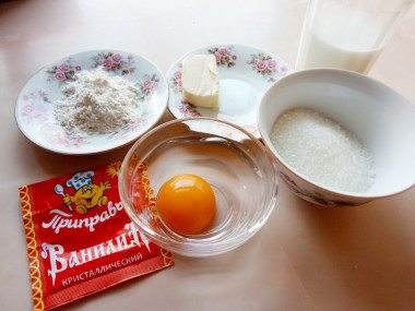 В большую миску отделите желтки, добавьте к ним ванильный и обычный сахар и хорошо разотрите венчиком. Если будет трудно размешивать, добавьте пару столовых ложек молока из общего объёма. Ванильный сахар можно заменить на ванилин. Как правильно это сделать читайте в отдельной статье по ссылке после рецепта.