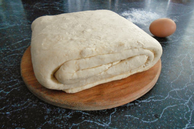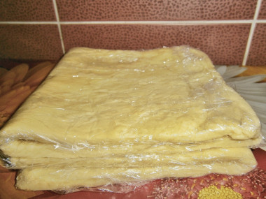 Когда-то я готовила слоеное тесто, но по сложному рецепту. Мне не понравилось, что очень долго, и я решила покупать готовое. Но, увидев этот рецепт, я передумала. Решила попробовать сделать слоеное тесто быстрого приготовления. Только увеличила ингредиенты в два раза, так как хотела делать большой торт. Использовала домашние куриные яйца, ледяную воду и мягкое масло. Муку взяла высшего сорта, но видимо качество другое нежели у автора, и у меня ушло на 150 г больше. Ничего сложного в приготовлении нет. В шагах всё подробно расписано. Смешала всё, раскатала тесто, смазала маслом, скатала рулет и свернула. Мне понравилось раскатывать улитку, это необычно, несложно и сразу много слоев получается) Отличная идея! Тесто свернула, завернув в плёнку, хранила недолго в морозилке до приготовления торта. По весу вышло больше 2 кг.