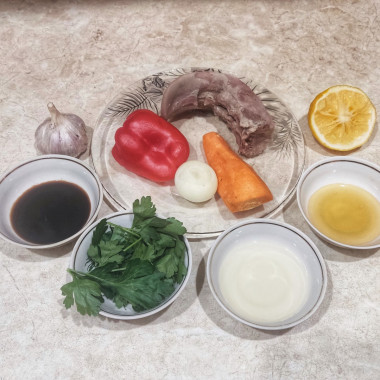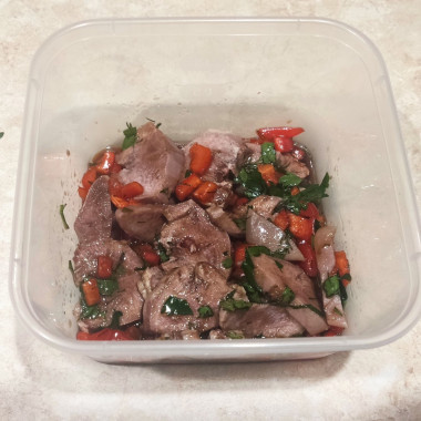 Блюда со свиным языком очень люблю, да и просто отварной язык вкусный. Но вот маринованный свиной язык приготовила впервые: заинтересовала такая идея! Готовила с одним языком на пробу и соответственно все ингредиенты брала половину. Эх, жаль готовила только один язык: очень вкусная закуска получилась. Язык отварила,очистила,порезала на ломтики,выложила в контейнер. Для маринада использовала половину болгарского перца, чеснок,соевый соус, мёд, масло растительное, лимонный сок. Единственное,что не использовала,это горький перец чили. Соединила все ингредиенты для маринада,залила язык и убрала на сутки в холодильник.