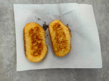На тарелке разложите бумажное полотенце или салфетки и выложите на них готовые гренки. Это необходимо для того, чтобы с них стек лишний жир. Пока гренки горячие посыпьте их по всей поверхности сахаром или сахарной пудрой.
