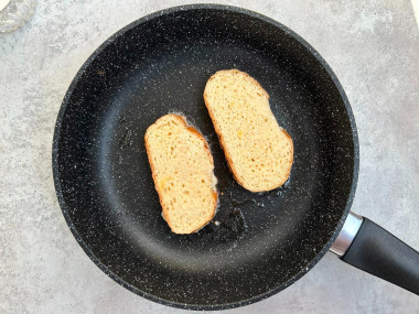 Выложите кусочки хлеб на горячую сковороду. Обжарьте хлеб в течение 1-2 минут. Затем переверните каждый кусочек лопаткой или вилкой и обжарьте с другой стороны еще в течение 2-3 минуты. Гренки должны покрыться румяной, аппетитной корочкой с двух сторон.