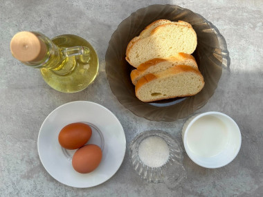 Как сделать гренки с яйцом и сахаром? Подготовьте все необходимые ингредиенты. Для приготовления лучше использовать вчерашний батон. Он должен быть слегка подсохший, так готовые гренки будут отлично держать форму. Нарежьте батон на кусочки толщиной примерно 1-1,5 сантиметра. У меня был хлеб уже нарезанный на ломтики.