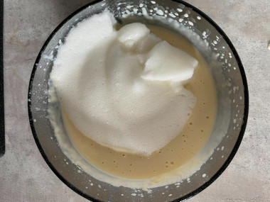 Взбейте белок на максимальной скорости миксера до пышной массы. К желтку добавьте теплое молоко, растительное масло, щепотку соли и сахар. Массу с желтком хорошо смешайте до получения однородной консистенции.