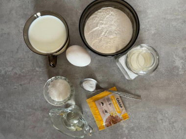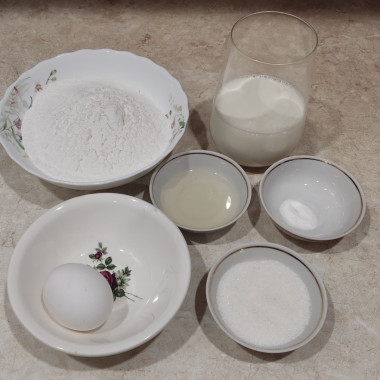 Приготовила все необходимые ингредиенты. Муку просеяла и смешала с содой, молоко слегка подогрела, яйцо разделила на желток и белок. Белок взбила до плотных пиков. Желток взбила с сахаром,солью. Добавила масло растительное, молоко,перемешала. Затем добавила муку с содой,перемешала миксером с насадкой для теста. В конце добавила взбитый белок и аккуратно перемешала лопаткой. Тесто получилось густое.