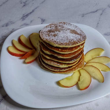 Ложкой выкладывала тесто на сухую сковороду в виде небольших лепёшек и обжарила с двух сторон. Готовые горячие панкейки слегка смазала сливочным маслом и после остывания посыпала сахарной пудрой. Панкейки из рисовой муки понравились на вкус: нежные,мягкие и очень вкусные!