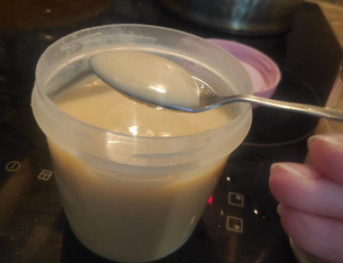 По вкусу получилась настоящая сгущенка. Из 900 мл молока у меня вышло 200 мл сгущенки. Дочка сначала подумала, что это какой-то крем, а попробовав, сказала, что «вкусно до ужаса»
