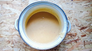 Так выглядело у меня молоко после часа варки. Оно уменьшилось в объеме и приобрело топленый цвет за счёт реакции карамелизации сахара. Продолжайте варить молоко дальше, не забывая помешивать.
