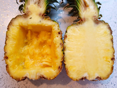 Подготовьте ананас. Острым ножом разрежьте его вдоль пополам, включая зелёную часть. Твёрдую сердцевину вырежьте, она не понадобится. Спелый ананас резать достаточно легко.