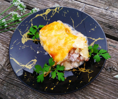 Также можно не выкладывать мясо и картофель слоями, а все перемешать и выложить в форму. Правда картофель в таком случае лучше нарезать не кружочками, а кубиками.