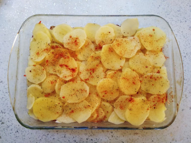 Последним слоем выложите оставшуюся картошку, слегка посолите, поперчите.