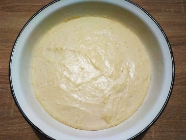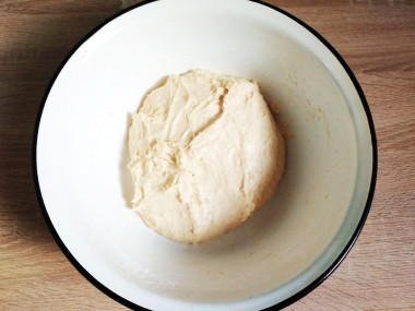 Положите тесто в глубокую миску и накройте пищевой пленкой. Миску я смазала остатками растопленного сливочного масла, но ее можно смазать также растительным маслом или слегка присыпать мукой. Оставьте тесто максимум на 1 час в теплом месте без сквозняков. Времени на подъем может уйти меньше - зависит от дрожжей и от температуры помещения.