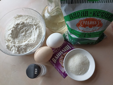 Как пожарить блины на кефире без соды? Подготовьте продукты по списку. Кефир заранее достаньте из холодильника, чтобы он стал комнатной температуры.