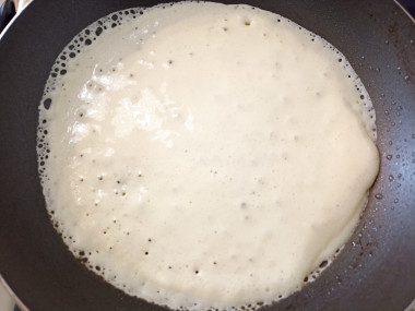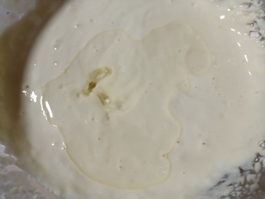 Снова перемешайте массу до однородной консистенции. Если тесто покажется слишком густым, можно добавить немного кипяченной теплой воды, тесто должно быть достаточно жидким, чтобы легко растекаться по сковороде. Добавьте в тесто растительное масло, чтобы блины не прилипали к сковороде и легко переворачивались.