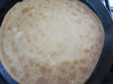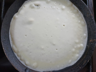 Разогрейте сковороду. При необходимости смажьте её небольшим количеством растительного масла. Вылейте на неё порцию блинного теста и распределите по всей поверхности, покачивая сковороду из стороны в сторону. Как только блинчик начнёт пузыриться, осторожно переверните его на другую сторону, поддев лопаткой. Жарьте все блины до красивого румяного цвета, пока не закончится тесто. О том, как подобрать сковороду читайте в статье по ссылке в конце рецепта.