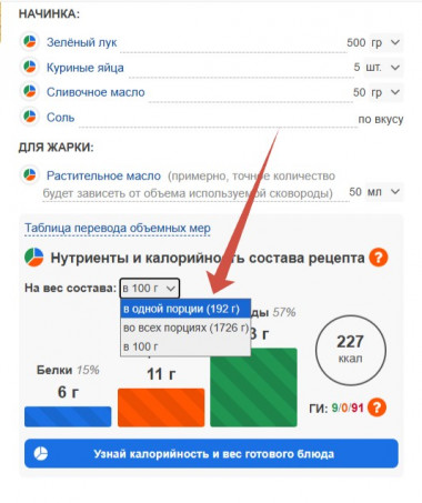 Я люблю делать пирожки среднего размера, но вы можете слепить и маленькие (тогда их получится больше) или крупнее (но меньше по количеству). В моей семье одна порция - это примерно 192 гр, то есть около 2-3 пирожков. Для вашего удобства я прикрепляю скриншот, на котором стрелкой указано, где отображается вес одной порции и общий вес блюда. При необходимости вы можете легко изменить количество порций с помощью калькулятора