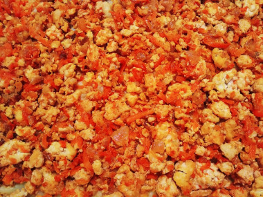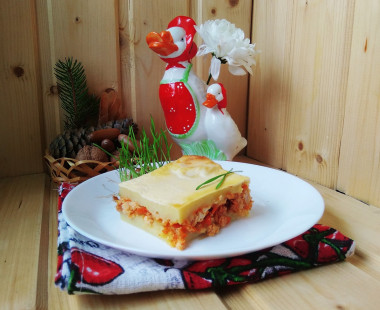 Форму для запекания — это может быть большая форма или несколько маленьких — смажьте небольшим количеством растительного масла. Выложите на дно формы половину картофельного пюре, затем обжаренный с овощами фарш.