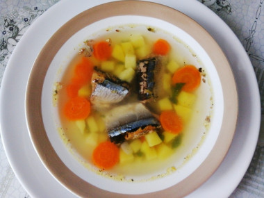 Когда овощи были готовы, добавила в суп сайру вместе с маслом из банки. Подержала суп на огне ещё 5 минут, а затем дала ему настояться еще минут 15.