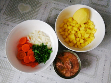 Как сварить суп из сайры консервы с картошкой? Для начала подготовьте все необходимые ингредиенты, так как суп варится довольно быстро. Овощи почистите и сполосните.