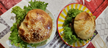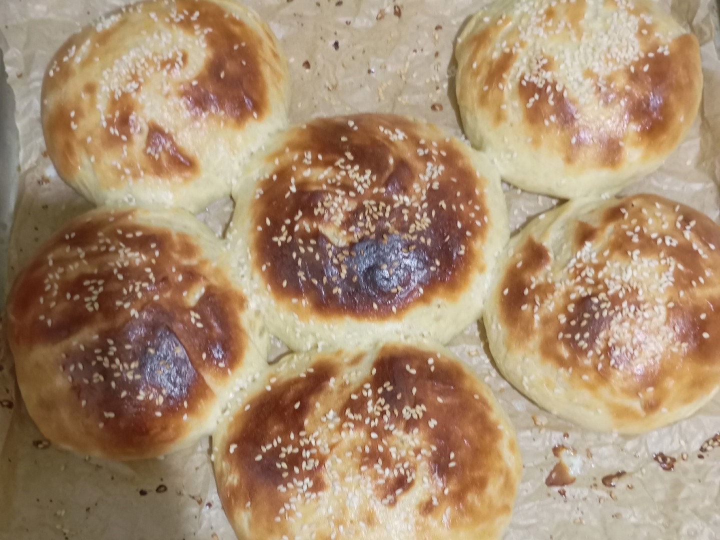 Булки очень вкусные, нежные, пушистые! Но у меня что-то пошло не так - количество муки пришлось увеличить на 300 грамм - никак не хотело собираться тесто, слишком много оказалось жидких ингредиентов для такого количества муки. Из-за этого немного не рассчитала итоговое количество булок, поэтому получились не булки, а БУЛКИ) Я очень сильно чувствую вкус яиц в выпечке, если смазывать сверху, поэтому заменила на молоко. Кунжут прилипает не так хорошо, но всё равно уцелел)