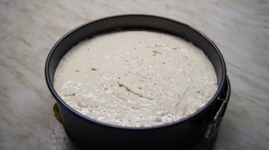 Возьмите подходящую форму для выпечки. У меня круглая, диаметром 18см. Чем больше будет форма, тем более плоской у вас получится запеканка, учитывайте это при выборе. Смажьте дно и бока формы кусочком сливочного или каплей растительного масла. Вылейте в нее тесто, разровняйте верх лопаткой.