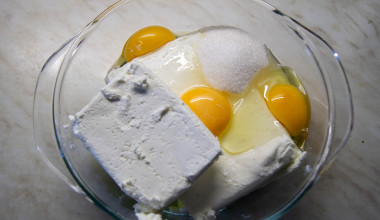 Возьмите глубокую миску. Выложите в нее творог. Вбейте яйца. Обязательно мойте яйца перед использованием, так как даже на кажущейся чистой скорлупе могут находиться вредные бактерии. Лучше всего использовать моющие средства для пищевых продуктов и щетку. Всыпьте сахар, ванилин и щепотку соли. Не бойтесь добавлять соль в сладкую выпечку — она послужит усилителем вкуса.