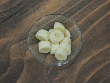 Вымытый банан очистите от кожуры и нарежьте на небольшие кусочки. Банан берите мягкий, не перезрелый, но и не жесткий зеленоватый. Кожица у банана должна быть насыщенного желтого цвета без черных точек.