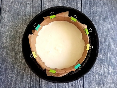 Подготовьте форму для выпечки. Для данного количества продуктов лучше взять форму небольшого диаметра, 16-18см. У меня раздвижное кольцо, 17см. Внутреннюю часть формы выстелите пергаментом. А снаружи оберните ее несколькими слоями фольги — пасха будет запекаться в воде. Вылейте творожную массу в подготовленную форму, верх разровняйте.