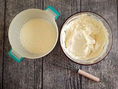 Блендер меня подвел , поэтому творог перетёрла через сито . Смешала с остальными ингредиентами . Взбила яйца с сахаром , ванилином и солью .