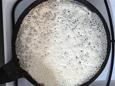 Можно переходить к жарке блинов. Сковороду смажьте кусочком сливочного масла и разогрейте ее. О том, как подобрать идеальную сковороду, а также как правильно выбрать масло, читайте в отдельных статьях, ссылки в конце рецепта. Вылейте на сковороду тесто, равномерно распределяя его по всей поверхности. Обжарьте блин с одной стороны до румяности на небольшом огне, после чего переверните и жарьте с другой стороны до румяности.