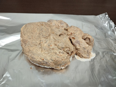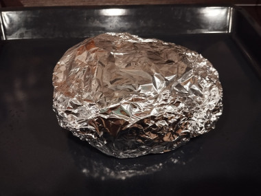 На следующий день выложила мясо в фольгу,завернула в несколько слоев и поставила в духовой шкаф запекаться при 180° на 1.5 часа.