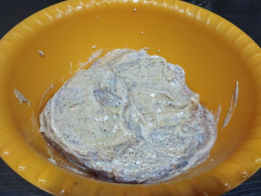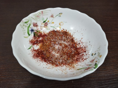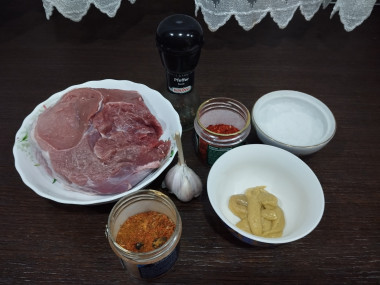 В миске смешала соль,специи для мяса. Свинину сначала натерла смесью приправ,затем обмазала горчицей и добавила немного сметаны. Выложила мясо в миску, накрыла пищевой пленкой и убрала в холодильник мариноваться на ночь.