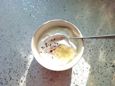 Добавляем соль и черный молотый перец по вкусу. Перемешиваем. По желанию и вкусу можно добавить еще какую-либо приправу, например, хмели-сунели или иную, которая подходит к мясу. Убираем миску с соусом в холодильник, он должен быть холодным и густым.