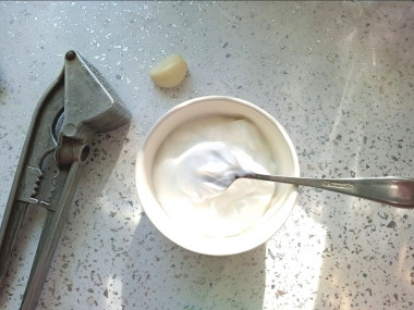 Чеснок чистим от пленочек, зубчики мелко рубим ножом или натираем на терке. Крупицы чеснока должны быть небольшими, но ощутимыми в соусе. Приготовленный чеснок кладем в миску со сметаной.