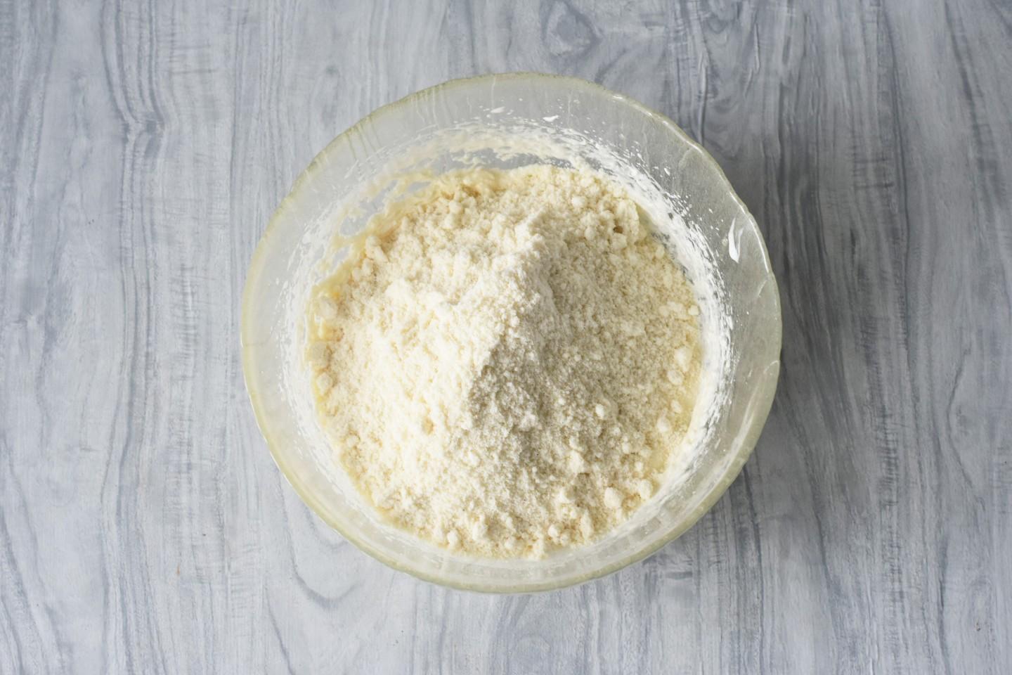 Всыпьте просеянную кокосовую муку.
