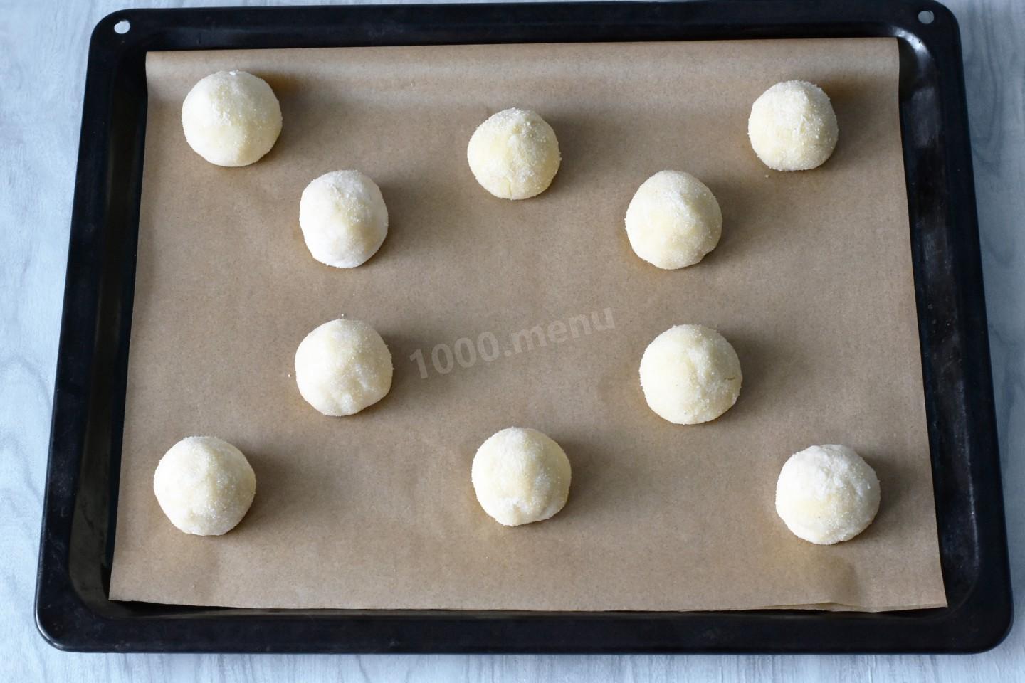 Переложите заготовки на застеленный пергаментом противень. Выпекайте печенье в разогретой до 180°С духовке 15-20 минут. Время и температура у вас могут отличаться. Подробнее читайте в статье о духовках. Ссылка в конце рецепта. Верхушки печения должны зарумяниться. Во время выпекания они могут слегка треснуть.